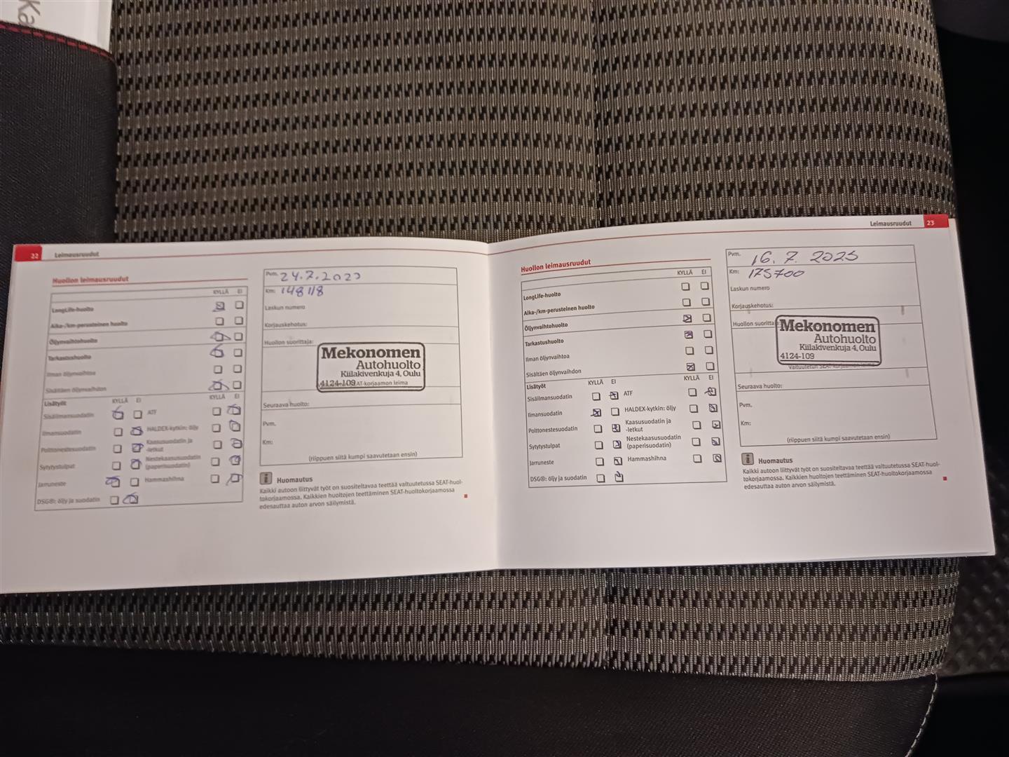 Täydellinen huoltokirja, Viimeisin huolto tehty 175tkm kohdalla, Kahdet renkaat, Aluvanteet, Uudet kesärenkaat, Lohkolämmitin ja sisäpistoke, Vakionopeudensäädin, Pysäköintitutka takana, Automaattinen ilmastointi Climatronic, Isofix -lastenistuinten kiinnitys takaistuimella, Kahdessa osassa kaadettava takaistuin, Sähkötoimiset ikkunat edessä ja takana, Takalasin pyyhin ja pesin, Monitoimiohjauspyörä, SEAT Sound System audiojärjestelmä CD aux-in, Metalliväri